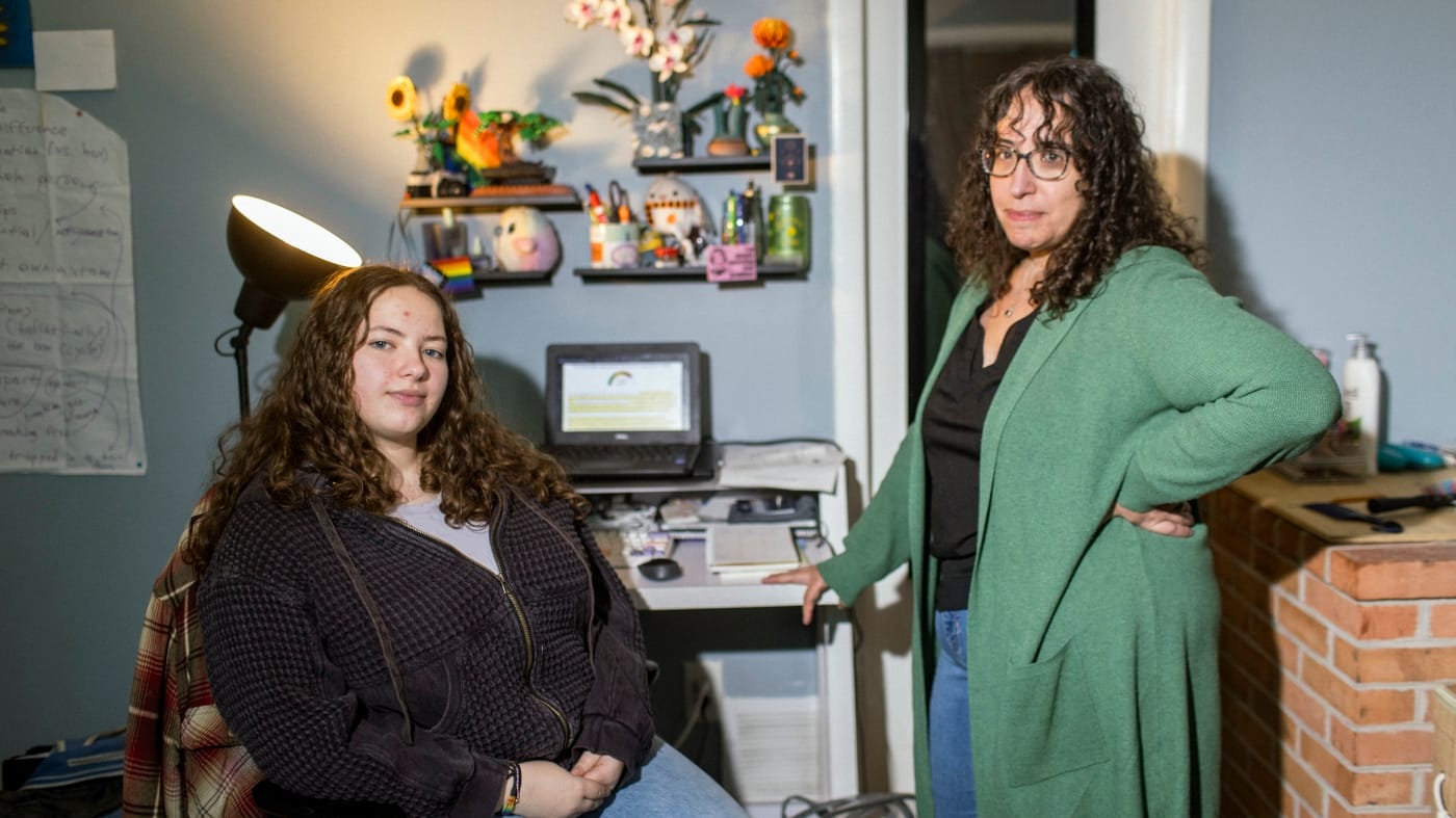 Ailsa Ostovitz, left, and her mother, Stephanie Rizk, at their home in the Maryland suburbs of Washington, D.C. In mid-November, Rizk met with Ostovitz’s teachers to discuss accusations that her daughter had used AI to do some of her schoolwork.
