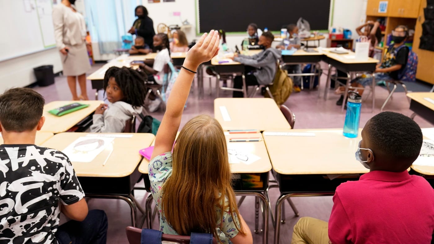 A student raises their hand in a classroom at Tussahaw Elementary School in 2021 in McDonough, Ga.